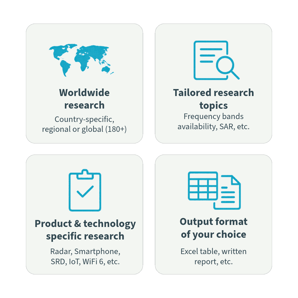 What sets Eleos apart is our depth of experience in RF regulatory compliance and our real-world experience of how regulators operate across different markets. We know the contacts and we know how to find the information you need, fast. Whether you're at the concept stage or preparing for deployment, our research services help you make informed, confident decisions about where and how to proceed.