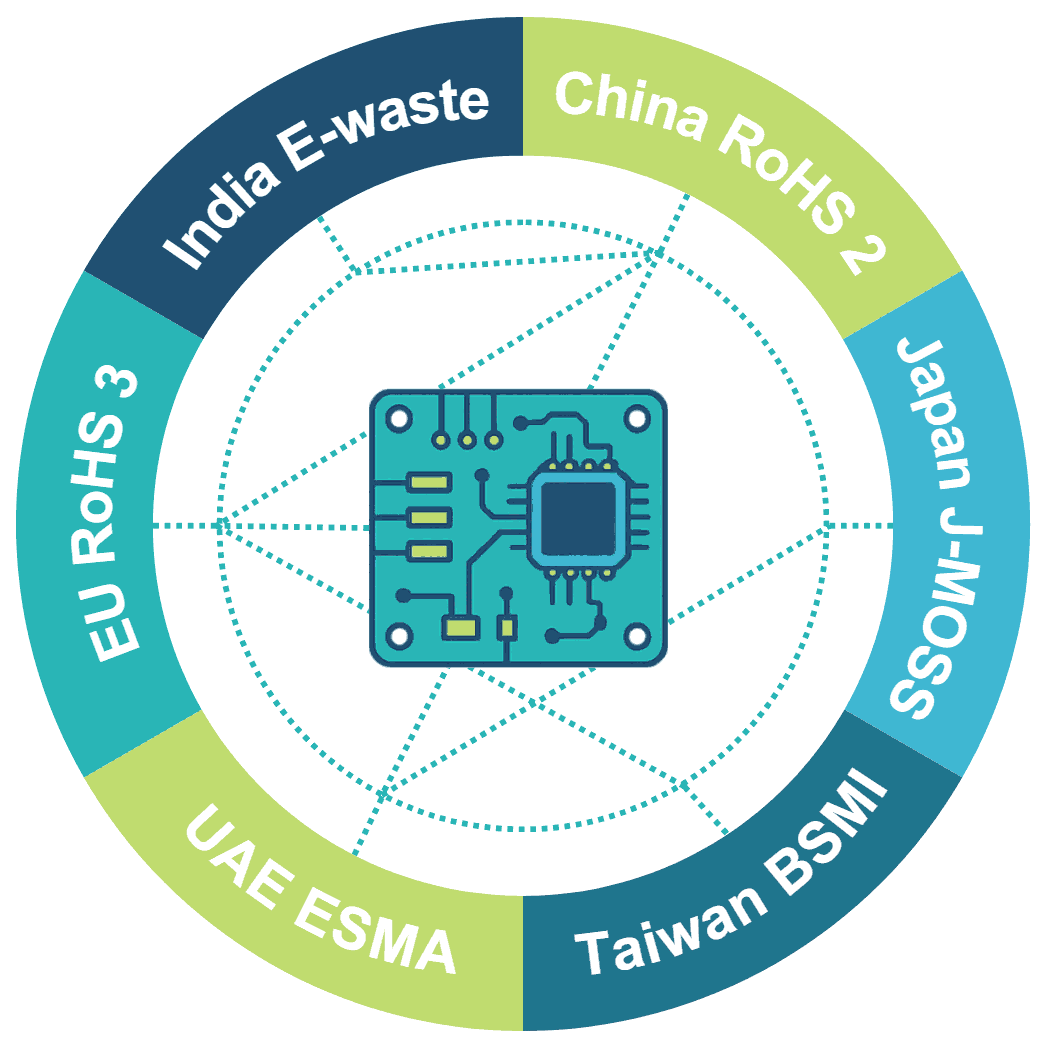 Le ayudamos a globalizarse con una única estructura de cumplimiento normativo, reduciendo la redundancia y garantizando el correcto cumplimiento de las normativas de cada mercado de destino: desde el marcado CE en la UE hasta el cumplimiento de la norma SJ/T 11364 en China y las normas BIS sobre residuos electrónicos en India. Gestionar estas diversas normativas de forma individual puede generar duplicación de esfuerzos, costes de laboratorio elevados y expedientes de cumplimiento inconsistentes.