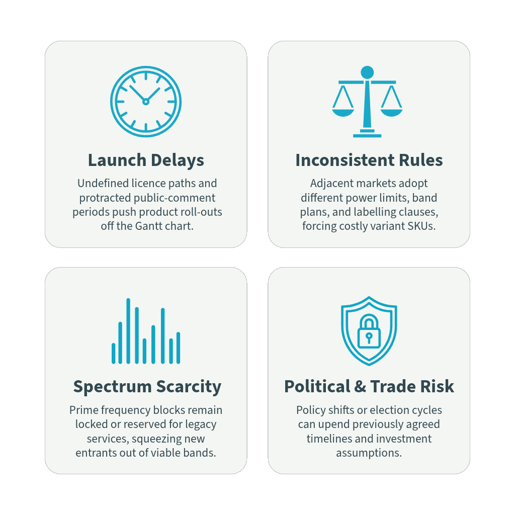 Regulatorische Rahmenbedingungen halten selten mit den neuen Mobilfunk- und Konnektivitätstechnologien Schritt. Während Ihre Ingenieure Millimeterwellenantennen oder Low-Power-IoT-Protokolle optimieren, arbeiten viele Behörden noch an Diskussionspapieren. Dadurch sind die Startpläne von unklaren Regeln, fragmentierten Frequenzplänen und wechselnden politischen Prioritäten abhängig. Ohne gezielte Interessenvertretung können Monate mit der Suche nach Klärungen, dem erneuten Testen von Hardware oder dem Warten auf Freigaben verloren gehen.