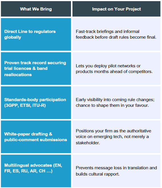 Dank unserer jahrzehntelangen praktischen Erfahrung in der Bewältigung der Komplexität globaler Märkte sind wir bestens aufgestellt, um Sie bei der Lobbyarbeit für Änderungen der Frequenzzuteilungspläne und der Akzeptanz neuer Technologien zu unterstützen.