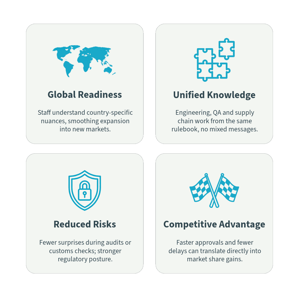 Les entreprises prospères s'appuient sur des fondamentaux solides et une volonté d'apprentissage continu. Eleos propose des formations sur mesure sous forme d'ateliers virtuels, allant de l'analyse approfondie d'un pays à une présentation détaillée des exigences et normes d'une région entière. Vos équipes seront ainsi mieux informées des exigences de certification et des facteurs concrets qui déterminent le succès d'un lancement international.